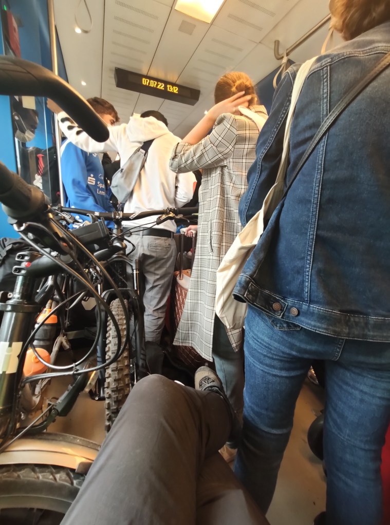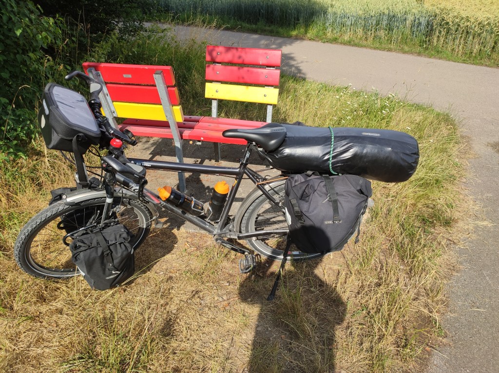 Nach einer kurzen Nacht in Gambsheim geht’s wieder nach Deutschland. Heute herrscht kein Wind,es ist bedeckt und angenehm zu radeln. Trotzdem bleibe ich bei meinem Plan. Kurz vor Karlsruhe nehme ich die S -Bahn, um mir die Fahrt durch die Stadt zu ersparen.Die erste ist voll, die zweite hat Platz.Der Zug nach Mainz ist rappelvoll.