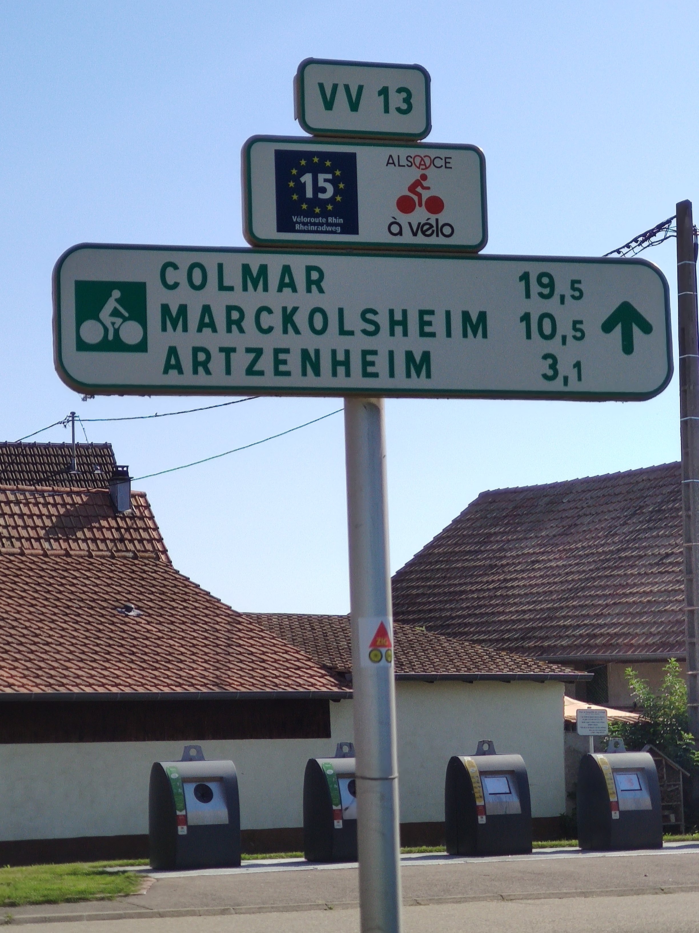 Schnurgerade unter einer Baumallee durch geht es bis kurz vor Straßburg.Nur der heftige Gegenwind stört das Fahrvergnuegen .Ich wechsle wieder die Seite und gerate dabei in ein Gewirr aus Autobahnen und Schnellstrassen.Dank NaviApp finde ich einen Feldweg,bevor es über die Rheinbrücke geht.