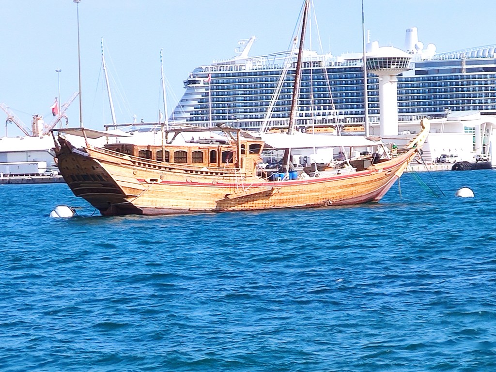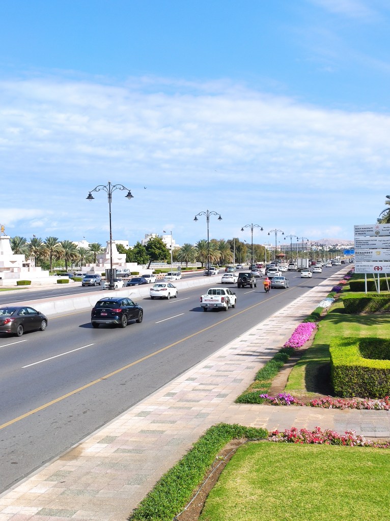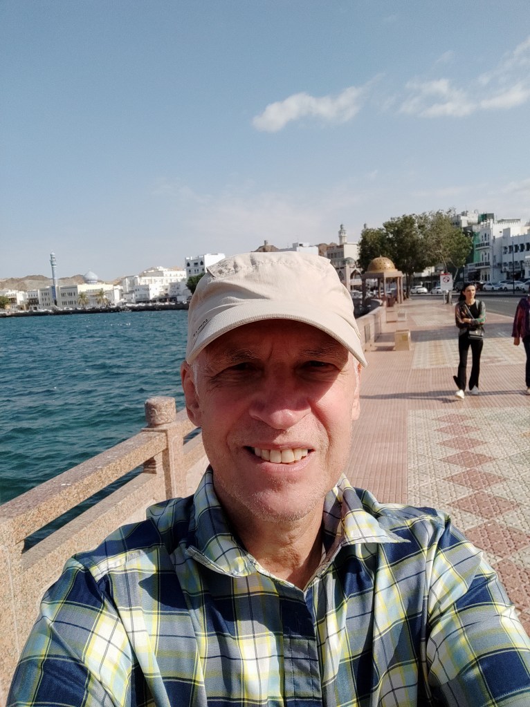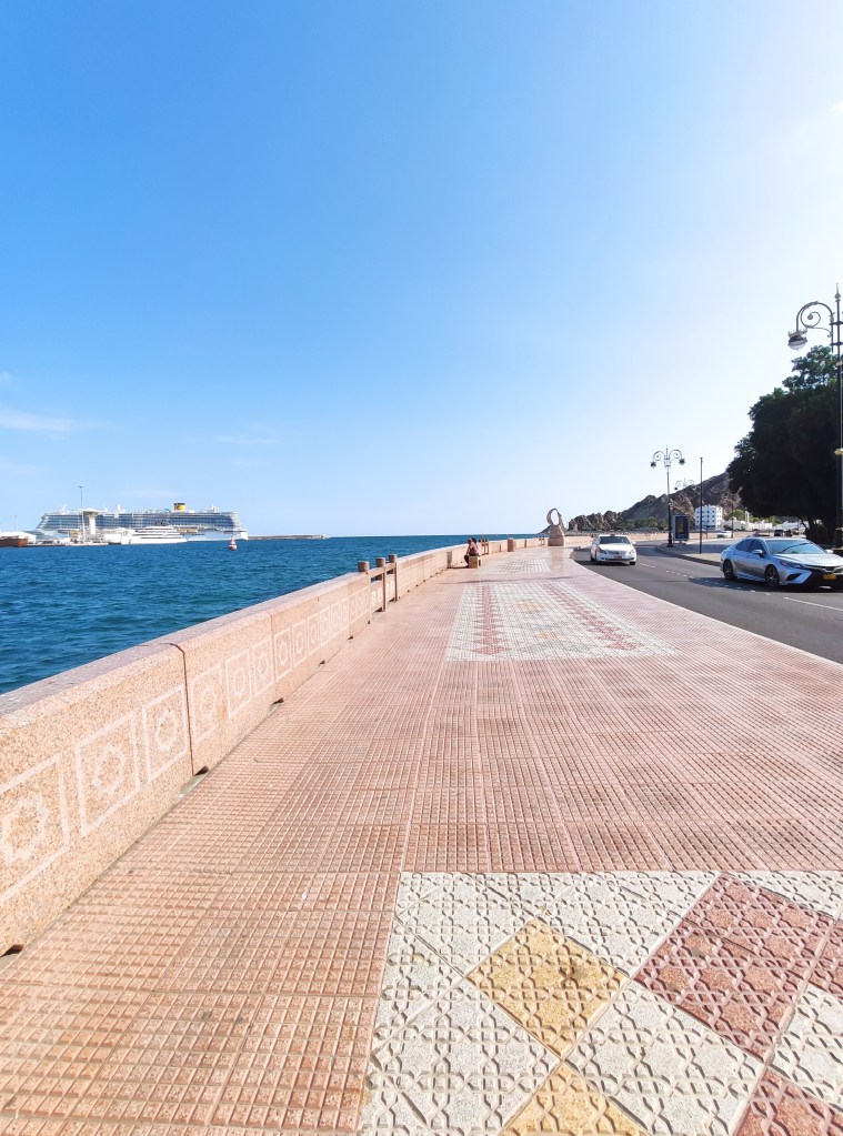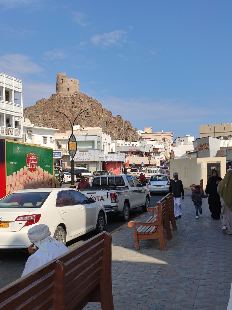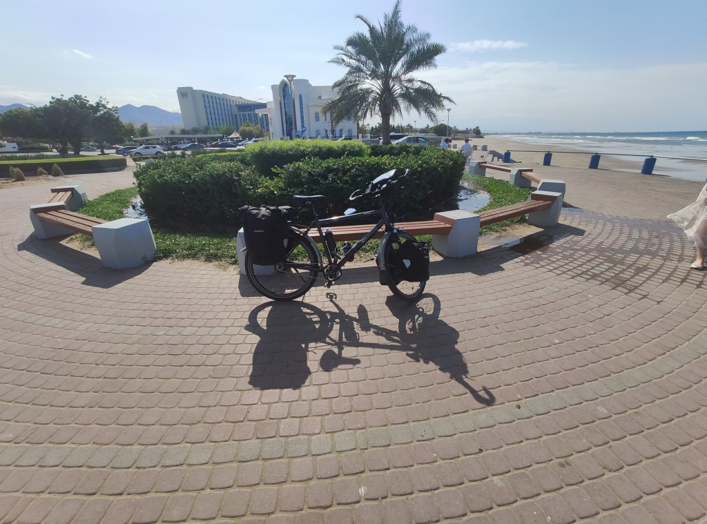 Die Landschaft ist grandios, die Straßen gut und,abgesehen vom Highway 17, verkehrsarm. Der Coffeshop in Argy hat nichts, also weiter in stetigem rauf und runter. Hatte ich anfangs mir die Wadis noch angeschaut, so bedeutet ein Wadischild vor allem: erst mal runter und dann wieder hoch. Das ist sehr kräftezehrend und ich muss öfter schieben . An einem windstillen Plätzchen esse ich ein paar Datteln und dann geht’s auf den Highway 17 Richtung Sur. Eigentlich hat die Straße einen 2m breiten Seitenstreifen,der gelb markiert sein soll, was selten der Fall ist. Der Verkehr ist enorm, die vorbeirasenden Autos gewöhnungsbedürftig.Gefaehrlich sind die Ausfahrten, ich fahre so lange wie möglich auf der Abbiegespur und erst im letzten Moment wieder geradeaus. An das Gruß -Gehupe habe ich mich inzwischen gewöhnt.