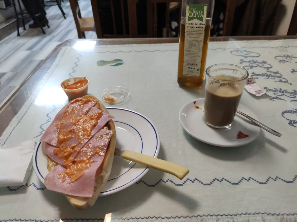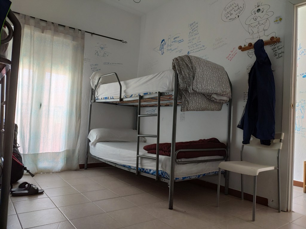 Oben angekommen, hat man einen herrlichen Blick über die hügelige Landschaft. Nach einem Kilometer bergab ist Almaden erreicht. Die privaten Herbergen sind dicht, der Supermarkt zu, es ist hier tote Hose. Ich habe Hunger, aber in den Bars oder Restaurants, wenn sie denn offenhaben, braucht man vor 7 oder 8 Uhr nicht auftauchen.Uebernachten tue ich wie alle anderen Pilger auch in der Albuerge municipal, eine Art Jugendherberge.Das Wetter war heute herrlich, die Füße haben auch durchgehalten soweit ich das beurteilen kann. Jetzt noch was zu futtern, dann bin ich zufrieden.